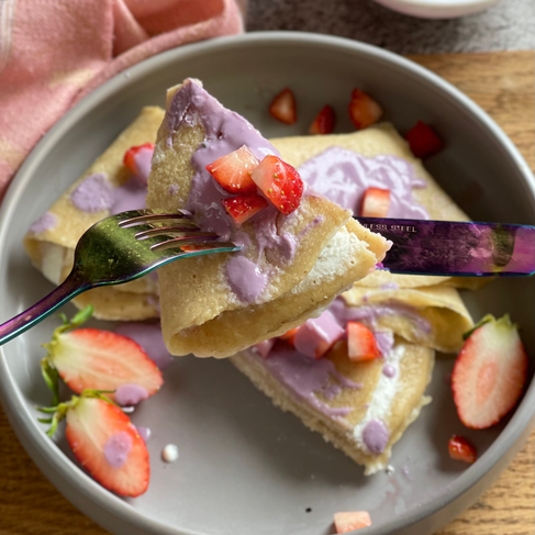 I don’t have much of a sweet tooth, so I don’t often share dessert recipes. But every now and then I prepare a sweet treat, like these vegan strawberry and cream crepes. They are sweet, soft, light, and filled with coconut whip and strawberries! Sometimes simplicity is best, and for this brunch, the combination of strawberries, cream and crepes is simplicity at its best. So simple and not too overly sweet, so perfect in my book.